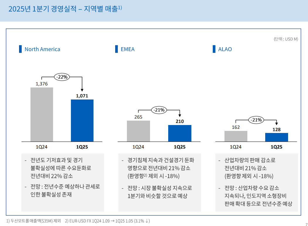 - 지역별 YoY 매출: 북미 –22%, EMEA –21%, ALAO –21% 두산밥캣+1FocusOn Mining, Aggregates & Constuction+1