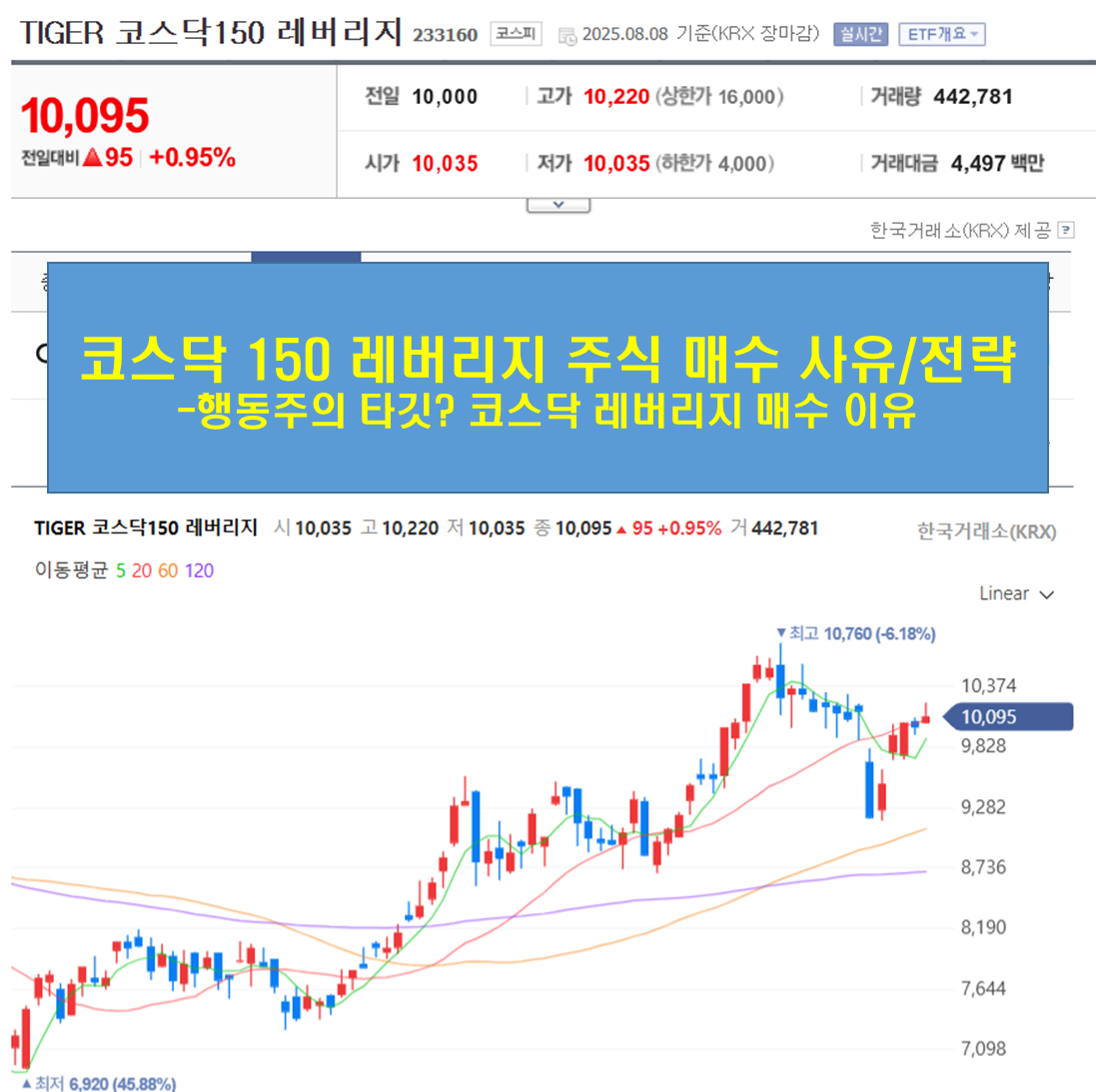 - 코스닥 개별 종목 선별 자신이 없어서, 코스닥150 레버리지 ETF로 분산 투자 선택.